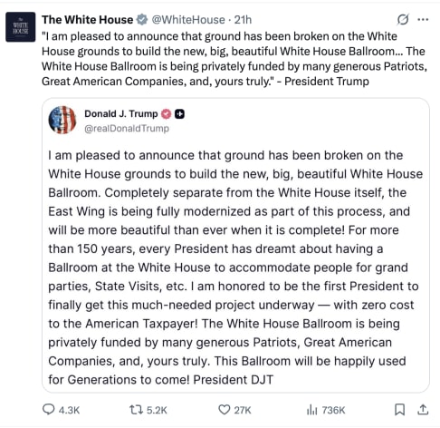 The administration’s construction project is estimated to cost roughly $200 million, with “zero cost to the American Taxpayer!” according to Trump, who posted on Truth Social that the project is being privately funded by unnamed patriots, companies, and himself. The demolition began this week, with hope of completion before Trump’s end of term in January 2029.