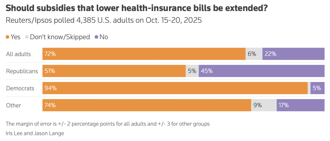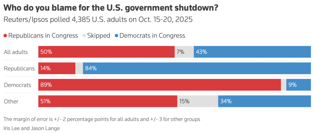 Thank you for being a free subscriber.. Don’t lose access. Please upgrade your subscription to Lincoln Square today with this limited-time offer. Join us on the frontline in the battle for our rights and freedoms under the law. It's our duty as Americans to defend democracy. Together. Polling from the past week offers a mixed picture of how Americans view the ongoing shutdown and the administration behind it. On the surface, the numbers might look stable — but underneath, there’s serious erosion. The ‘Bump’ That Isn’tYou may have seen Reuters headlines this morning claiming Trump’s approval ticked up two points since the start of the month, or CNN’s Harry Enten arguing the shutdown hasn’t hurt him much. The problem: those shifts are within the margin of error — statistical noise, not a trend. Republicans Take the BlameIn reality, the shutdown is hurting Trump — and more importantly, his party.