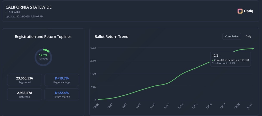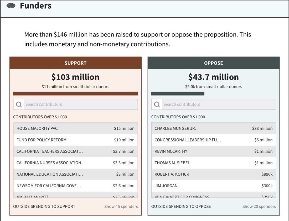 The Podcast on YouTube: (When you embed a YouTube video on Substack, it is set not to let you watch it on the YouTube app, but if you want to go there, or just enjoy the link to share, it’s right here.) I am working on some other Podcasting apps… If you enjoy this kind of video podcast commentary from Jon, say so. Either by clicking the like button, re-stacking this, and of course, if you give Jon direct feedback by either replying (if you got this via email) or by dropping Jon a note using the button below. Links to column mentioned in the Podcast: More for paid subscribers below the paywall. Click the button below for a free trial and unlock the 40% of our content that is behind paywalls! Want to know all of the turnout numbers and other data? It’s down below. Want to see who the big money is coming from on both sides? It’s below. Want to punch in your address and see how this re-do affects your district? It’s below. Bonus Content: Real Time Election Turnout DataThanks to our friends at Optiq here is a dashboard that gives you access to more data about the Prop. 50 election turnout than you could possibly want. (By the way, it’s actually counter-intuitive to write a word that ends in a q. Who knew?) Looking up donors and how your home is impacted…Cal-Matters has the greatest dashboard for this kind of realtime information… Their funding dashboard is updated all of the time, and you can interact with it to get more data. And below — well you can see where I punched my address into their nifty tool and you can see where I currently live in a Republican district represented by Congresswoman Young Kim, but how I will be gerrymandered into a Democratic district represented by Congresswoman Linda Sanchez. Finally, my favorite No On 50 Video, which has appeared on this site before, but you cannot share it enough… You’re currently a free subscriber to So, Does It Matter? California Politics! For the full experience, upgrade your subscription. See how much more you get with an inexpensive, paid subscription, but clicking the button below! Support me in providing hard-hitting, clear-eyed analysis of California politics. I am beholding to no one, and sugar-coat nothing! |