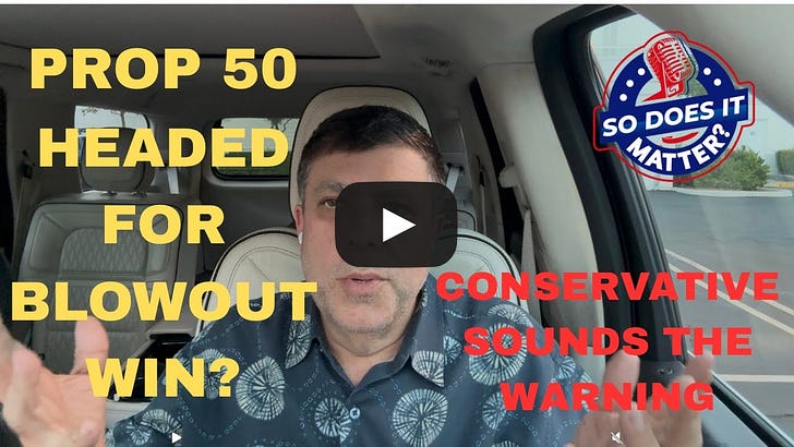 Our podcasts are available to our thousands of free subscribers (and others who join us), but we do have some exclusive related content typically below the firewall at the bottom of these posts for our hundreds of paid subscribers! But, in honor of the Dodgers making the World Series, we have unlocked the bonus content today! Paid subscriber got this early this morning. ⏱️ 24-minute-long podcast Typically, each week, site publisher Jon Fleischman, a veteran of California politics for over three decades, brings on a guest for a one-on-one interview focused on some aspect of California politics or policy. This week, Jon takes a break from his usual routine to bring you a special 25-minute solo podcast, where he provides a detailed analysis of the current state of the Proposition 50 campaigns. Jon, of course, is a partisan — as a constitutional conservative and Republican. He’s a former regional Vice Chairman and former Executive Director of the California Republican Party. But Jon is known for his candor, especially when engaging in political analysis, and in this “must listen” podcast, Jon walks through why the campaign is not going so great for opponents to Prop. 50 right now, and also takes a deep dive into why that is the case. He closes with a discussion about what happens if Proposition 50 passes — because the fight at the ballot box is not the last fight to defeat the cynical measure. I’m experimenting with uploading podcasts to different platforms. At the bottom of this post, you'll find links to the podcast on Apple Podcasts and Spotify, as well as a YouTube upload.