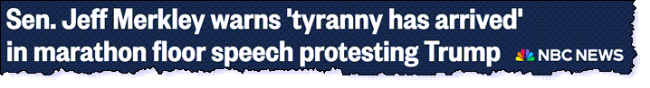 Newsweek reports, "In a marathon speech, Merkley, a progressive, says 'This is an incredible threat to our nation, to the entire vision of our constitution, to the entire platform on which our freedom exists.'"