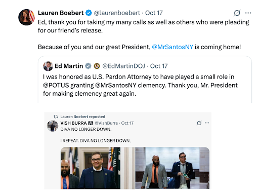 Last week Boebert’s efforts paid off. Santos was granted clemency by President Trump. She celebrated with a post taking credit for his release and retweeting the “DIVA DOWN” meme.