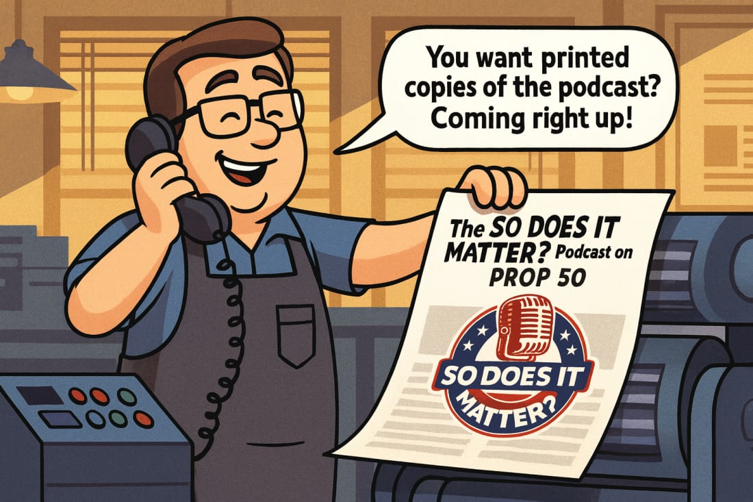 This morning I published a 25 minutes or so podcast on why Prop. 50 in California is likely to pass. I got into a lot of details. Now I’ve been inundated with requests from people wanting to read it rather than listen to it. I don’t know if I should be offended? Anyways, if AI did its job right below is a digestible but very lengthy copy of what I said in my podcast. It’s not quite a transcript. I had it formatted differently for ease of reading… Here is a link to the video podcast and also at this link you can find a YouTube video and also players for Apple podcasts Spotify, etc. SO, DOES IT MATTER? PODCAST ON PROP. 50 — FORMATTED TO READ Podcast Summary: Proposition 50 and California Politics Introduction to Jon Fleischman and the Podcast: “Hey, it’s Jon Fleischman, and welcome to a podcast for the So Does It Matter website on California politics. Or maybe it’s really supposed to be pronounced so. Does it matter? That’s really how we’re supposed to say it, because we’re talking about things that truly matter going on in California politics, largely in California politics. I stray every once in a while.” “Anyways, by way of self-introduction, for those of you who might be tuning in for the first time, my name is John Fleischman. I’ve been involved in California politics for well over three decades. It seems like a long time ago, since the late 80s, when I first got involved.” “Ronald Reagan was president of the United States, and I actually got to meet him. Shortly after his presidency, I got to have Taco Bell with him. For those who are curious, he loved the Enchirito. But that’s a whole other story for another day.” “Anyways, I’ve been working on campaigns and involved with punditry and analyzing California politics for a very, very long time. I’ve built up a very large network of contacts and people. I have a lot of experience to draw upon.”