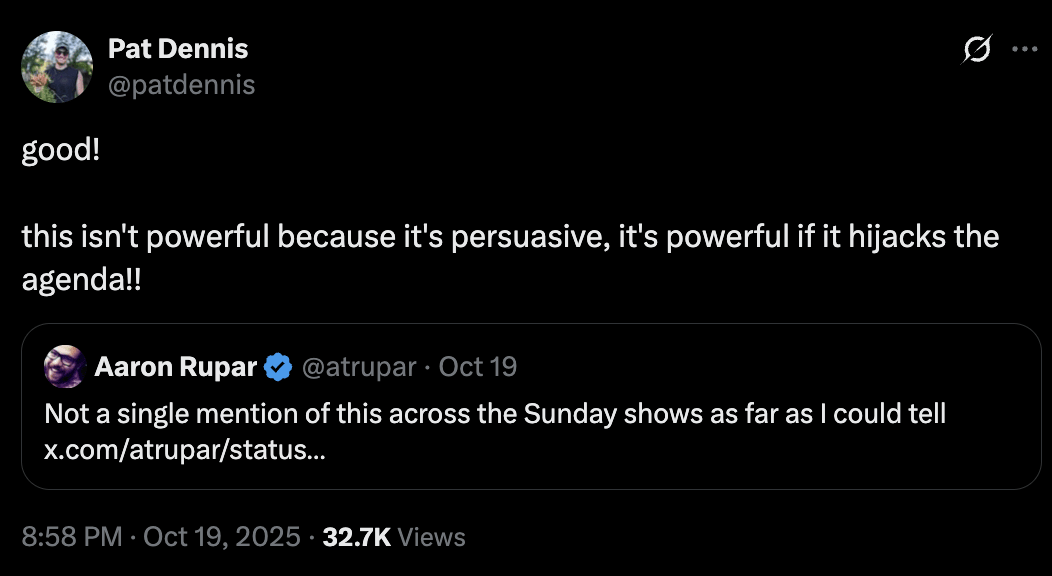 Meanwhile, Trump doing that very thing couldn't even warrant a discussion on the Sunday shows today. Sun, 19 Oct 2025 20:26:18 GMT View on BlueskyMainstream media should do better. But a big reason the political press would fixate on this story if the parties were reversed is that Republicans would emote angrily, and in unison, about a Democrat doing something so obscene. Here, by contrast, is the president of American Bridge—a Democratic Super PAC—celebrating the fact that the mainstream media downplayed the A.I. shit-dumping story. He thinks controversies like this won’t persuade many people to oppose Trump, but that if journalists treat it as a scandal, it might crowd out more helpful storylines. This is how the overwhelming majority of Democratic strategists and consultants think. What Republicans understand that Dems do not is that there’s value in hyperventilating about any story that makes the opposition look bad. If it doesn’t catch on, fine, move along to the next one. “But what if it crowds out the master narrati-” NO, who cares, be angry about everything that’s genuinely infuriating about your opponents. The result will be to create an unpleasant miasma around them that is more powerful than any collection of lab-perfect lines of persuasion. I’m not losing sleep over the fact that the feces fighter-jet story didn’t make a bigger splash (so to speak) but I do wish Democrats thought harder about how public opinion takes shape—to consider the psychological and social layers, not just the quantitative one. They might realize that it’s usually not by scaling up a message that seems to be persuasive in an intimate or controlled setting. lauren: As we lament the lack of fierce Democrats, the campaign against Graham Platner is in full force. Can you imagine the difference between having him in the Senate versus old Janet Mills, part of the same old clique that is doing nothing? With apologies to Lauren, who submitted this question before the most recent Platner scandal came to light, I have a real issue with the guy now. Or at least I think I do. My hang up isn’t any past indiscretion, even the Nazi skull tattoo that’s engulfed his campaign in a firestorm. It’s about trust. Let me explain. There are, to my mind, about five ways someone like Platner could end up in this tattoo predicament. In descending order of seriousness, they are:... Subscribe to Off Message to unlock the rest.Become a paying subscriber of Off Message to get access to this post and other subscriber-only content. A subscription gets you: