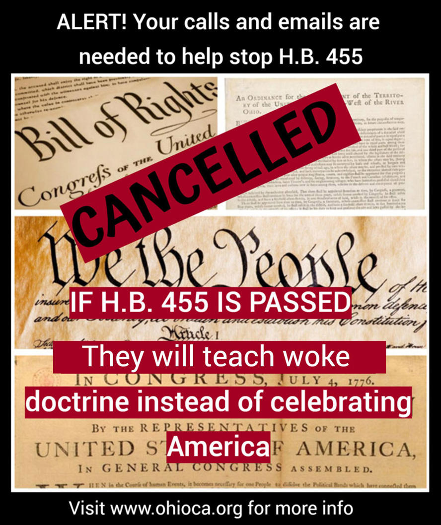 ALERT: The bill received sponsor testimony on Tuesday in the Ohio House Education Committee. This is the liberal teachers union's fourth attempt over the past seven years to eliminate the Founding of America Documents - Curriculum that was passed into law in 2012 and is now in its thirteenth year of implementation in Ohio schools from the 8th - 12th grade. Our students are required to learn one-half credit hour of American Government and one-half credit hour of American History with an end of course exam. The exam requirement is the guarantee that it will be taught in all of Ohio's 88 school districts. Now they want to get rid of it!!! We are watchmen on the wall. Let's safeguard the teaching of American Government and American History in Ohio's schools.