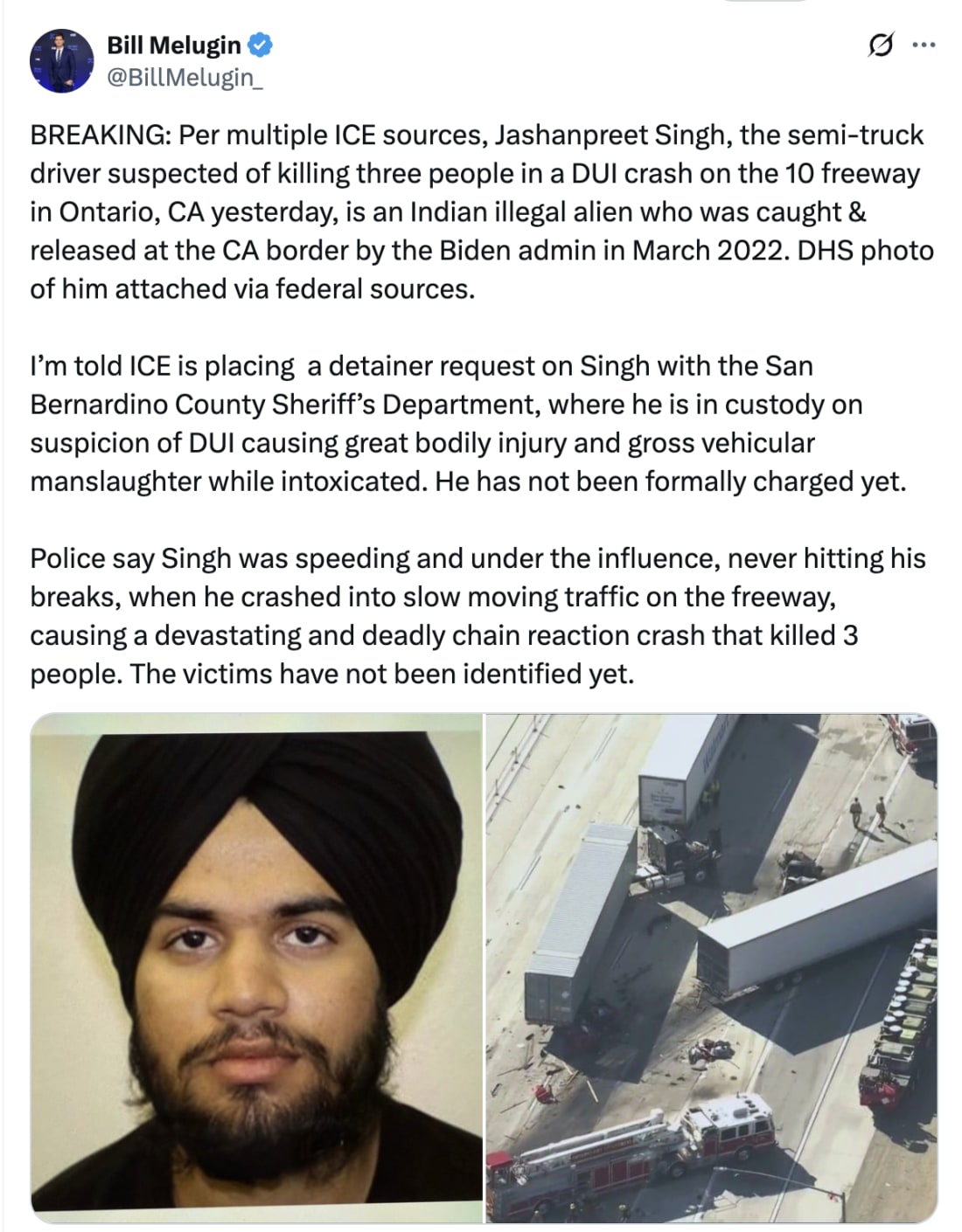 It’s called the native markets, and it’s where EVERY crypto millionaire made their fortune. Not by buying Bitcoin at $100k, but by accessing tokens at inception prices before retail even knows they exist. Think about it: When you buy on Coinbase, you’re the EXIT liquidity. When you buy on native markets, you’re the EARLY investor. Which would you rather be? The window is closing. Once mainstream adoption hits, these arbitrage opportunities disappear forever. Watch the free training video to learn how to access the Native Markets → Tan Gera, CFA P.S. Less than 0.2% of investors know native markets exist. The other 99.8% are buying at 50x markup on Coinbase. Which group do you want to be in? Get your free training now. Illegal immigrant arrested in deadly California crashJashanpreet Singh, a 21-year-old illegal immigrant from India who crossed the southern border in March 2022 and was released by the Biden administration pending an immigration hearing, has been arrested on suspicion of gross vehicular manslaughter while intoxicated after his semi-truck plowed into slow-moving traffic on the I-10 Freeway in San Bernardino County.