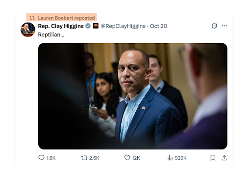On Monday, Lauren Boebert began pushing a new conspiracy theory that House Speaker Hakeem Jeffries is a "reptilian."