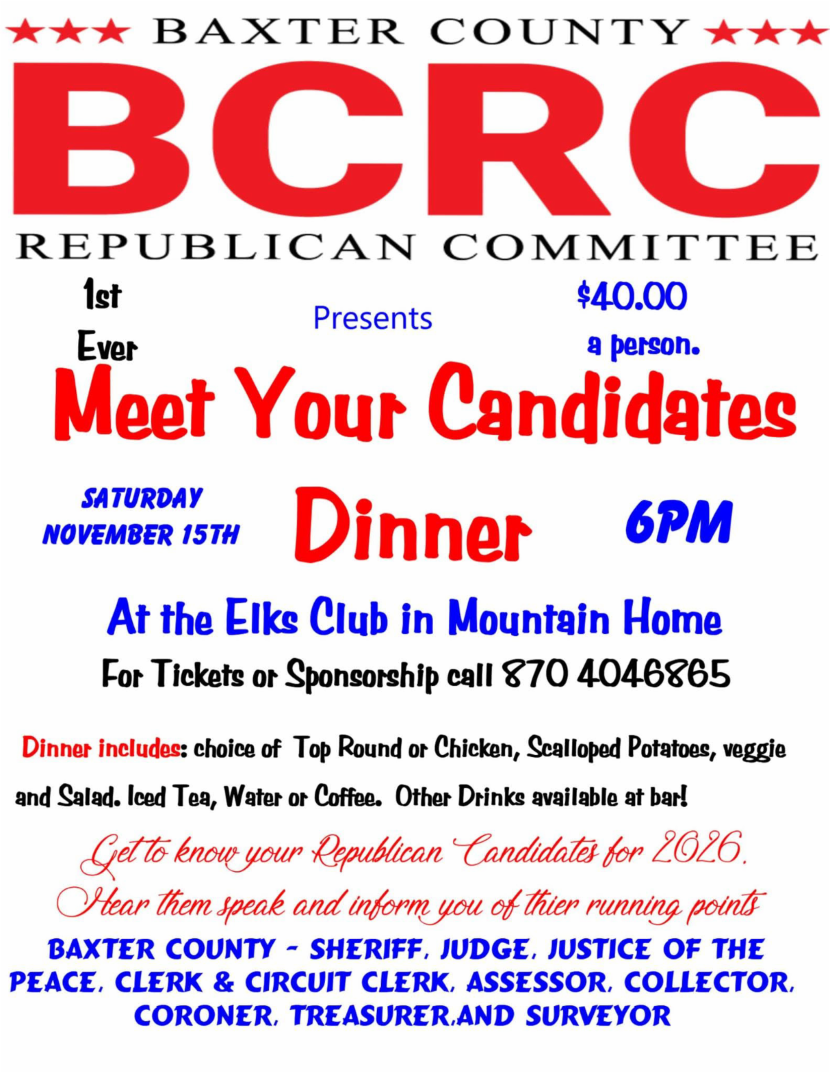 | | This email may be clipped. Click "view entire message" at the bottom of this email to view entire list | | Other Upcoming Happenings | | Lawrence County Republican Committee Trump Day Dinner | | Garland County Republicans Lincoln-Reagan Dinner with Missouri Congressman Jason Smith | | Johnson County GOP Lincoln Day Dinner with U.S. Senator Tom Cotton | | Benton County Republicans Star Stripes and Southern Nights Dinner with Attorney General Tim Griffin | | Baxter County Republican Committee Meet Your Candidates Dinner | | Yell County Lincoln Day Dinner with Secretary of State Cole Jester and Arkansas National Hispanic Assembly President Michelle Graetz | | Miller County Republican Committee Candidate Meet and Greet | | |