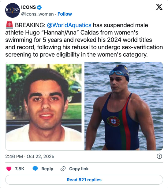 It’s called the native markets, and it’s where EVERY crypto millionaire made their fortune. Not by buying Bitcoin at $100k, but by accessing tokens at inception prices before retail even knows they exist. Think about it: When you buy on Coinbase, you’re the EXIT liquidity. When you buy on native markets, you’re the EARLY investor. Which would you rather be? The window is closing. Once mainstream adoption hits, these arbitrage opportunities disappear forever. Watch the free training video to learn how to access the Native Markets → Tan Gera, CFA P.S. Less than 0.2% of investors know native markets exist. The other 99.8% are buying at 50x markup on Coinbase. Which group do you want to be in? Get your free training now. Transgender swimmer banned for refusing gender testAna Caldas (who goes by Hannah), 47, received a five-year ban from World Aquatics and was stripped of all competition results between June 2022 and October 2024 for allegedly refusing to take a gender verification test, which stemmed from a Texas Attorney General investigation into U.S. Masters Swimming.