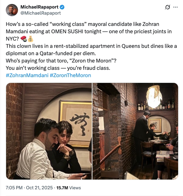 “Fraud class” Mamdani BUSTED for dining at expensive restaurant - Man of the people act falls apartActor Michael Rapaport posted photos on social media of NYC mayoral frontrunner Zohran Mamdani eating at Manhattan’s Omen Azen sushi restaurant, where a nine-course tasting menu costs $145, calling him “Zoron the Moron” and accusing the “working class” candidate of being “fraud class.”