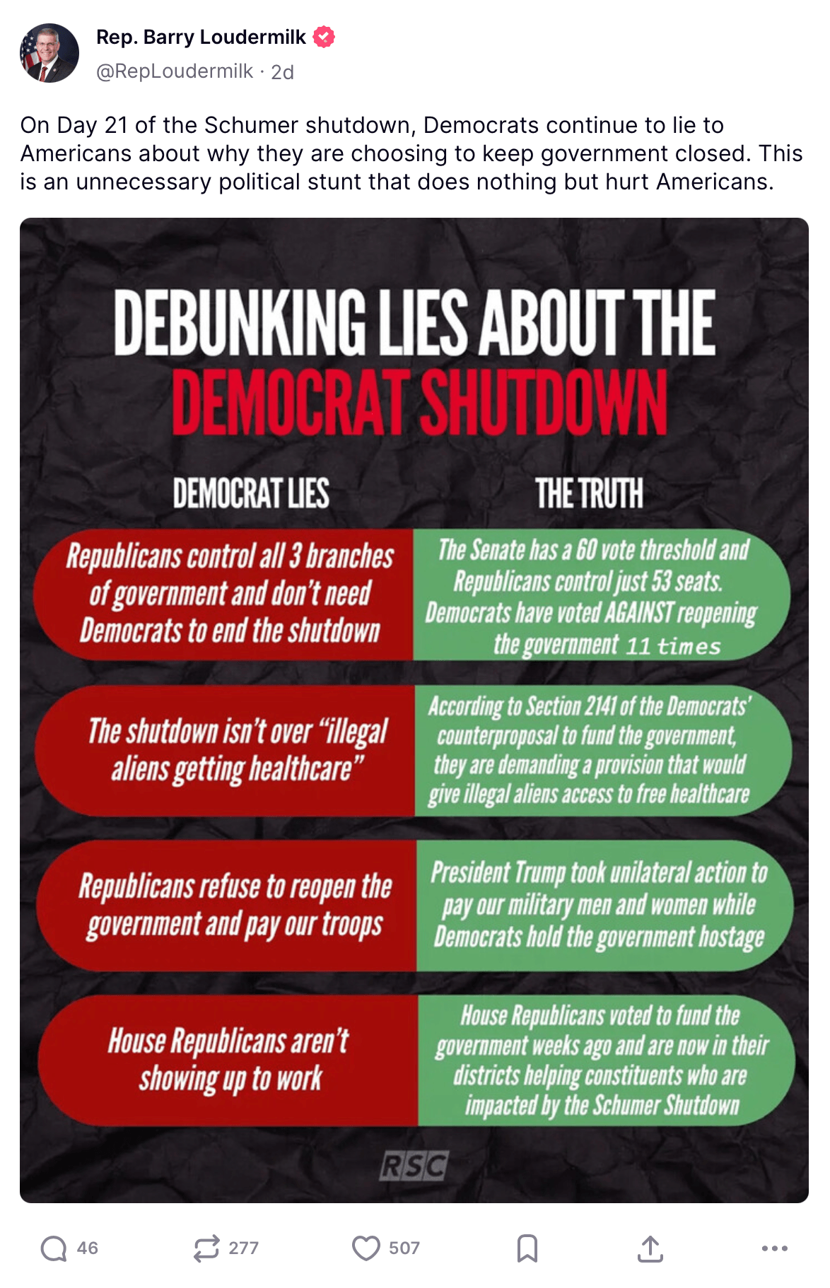 Friends, I hope you are doing well. As your Representative in Congress, it’s a priority to keep you informed of how we're serving you. If you would like to stay up to date, check out our website, and follow our Facebook, Twitter, and Instagram pages. Looking forward to seeing you in Georgia's 11th Congressional District or in Washington, D.C. soon. | Rep. Barry Loudermilk U.S. Congressman, Georgia's Eleventh District | UPDATE: Constituent Services/Tours During Lapse in Funding | Rep. Loudermilk Authors Letter to Georgia Financial Institutions Requesting Flexibility for Servicemembers and Federal Workers During Shutdown | The impacts of the ongoing federal government shutdown continue to be felt by Americans in Georgia and across the country. Over one month ago, the U.S House of Representatives passed a continuing resolution that would fund the federal government through November 21, 2025, at spending levels previously supported by President Biden and congressional Democrats. READ MORE | 🚨ONE MORE WEEK🚨: Middle School and High School Students Can Participate | Jobs & Career Resources Available in Georgia | Washington DC Office 2133 Rayburn House Office Building Washington, DC 20515 Phone: (202) 225-2931 | Woodstock Office 9898 Highway 92 Suite 100 Woodstock, GA 30188 Phone: (770) 429-1776 | Cartersville Office 135 West Cherokee Avenue Suite 122 Cartersville, GA 30120 Phone: (770) 429-1776 | |