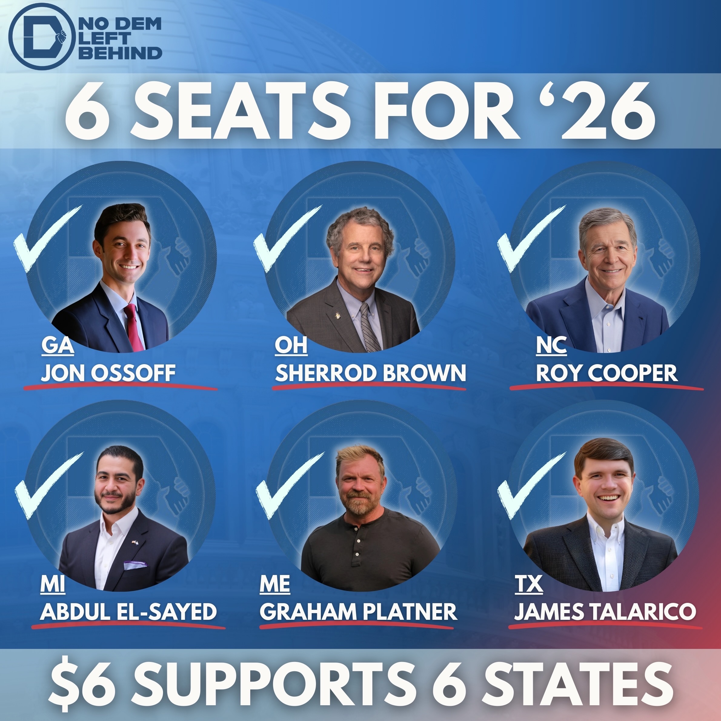 That’s why No Dem Left Behind is going all in to rally behind six working class champions who represent the future of our democracy: