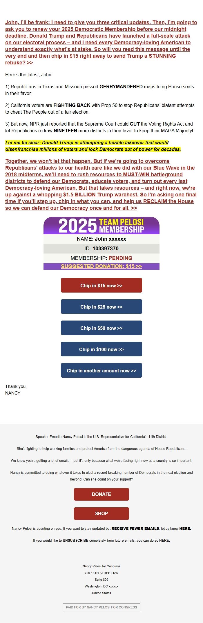 John, I’ll be frank: I need to give you three critical updates. Then, I’m going to ask you to renew your 2025 Democratic Membership before our midnight deadline. Donald Trump and Republicans have launched a full-scale attack on our electoral process – and I need every Democracy-loving American to understand exactly what’s at stake. So will you read this message until the very end and then chip in $15 right away to send Trump a STUNNING rebuke? >> [[link removed]]
