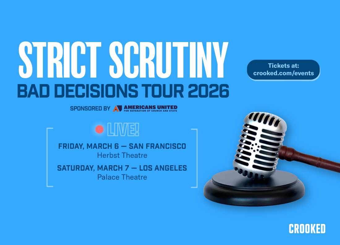 If the Bad Decisions Aren't Stopping, Neither Are WeWe want smart, conscientious people to be able to reach other people, and convince them to care about law, democracy, and everything in between, too.Sometimes we hear from listeners, “You three make me feel less alone.” Or, “You three make me realize I’m not paranoid. They really are coming after our democracy and our rights!” It’s not that we necessarily like hearing these things (we’d prefer if our democracy and our rights weren’t so up for grabs). But since that’s kind of where we are, we do like being able to provide a kind of community for people who care about law, politics, and society, and the relationship between them. We want smart, conscientious people to be able to reach other people, and convince them to care about law, democracy, and everything in between, too. And if we’re being honest, we need that community, too. It’s so nice to be surrounded by a group of well-meaning, fun, motivated people who want to fight for our democracy, our laws, our rights, and our courts. It’s way better than doomscrolling through the latest Supreme Court opinion, shadow docket nonsense, or oral argument transcript. Which is why we are beyond excited to be hitting the road more in the coming SCOTUS term. DC, we’re coming back at you: We had such a great time with a crowd that cheered (cheered!) for Chevron deference, administrative agencies, and federal government workers that we’re going to be back in DC at Crooked Con on November 7, where we’ll break down the oral arguments in the tariff cases being argued earlier in the week at the Supreme Court. (If the President is going to descend on SCOTUS for the occasion, we will too! Although in fairness, we did say we’d be there first…) We’re also (finally!) able to announce…some West Coast stops on (the never-ending) Bad Decisions Tour. When we named the tour the Bad Decisions Tour, we weren’t trying to manifest—really. So, San Francisco and Los Angeles—we’ll be there in March! Specifically, March 6th in San Francisco and March 7th in Los Angeles. It’s been difficult with our teaching schedules/full-time jobs to be able to find a time when we could all get to the West Coast, and we’re thrilled to finally be able to make this happen. We’re not trying to follow ICE and the National Guard around the country (or maybe they’re following us?), but between Chicago, DC, and LA…there is kind of a pattern. In any case, we are SO excited to be able to see and meet more of you soon. Sometimes on the podcast we throw out the phrase “popular constitutionalism.” It’s a term that just describes popular invocations—people’s invocations—of the constitution. It describes when people and popular movements make claims about the constitution and what it means—claims that don’t depend on what silly justices of the Supreme Court do or don’t say. It’s when people insist the constitution doesn’t require the president to have immunity and impunity for interfering with the peaceful transition of power following a legitimate election (even when the Supreme Court says otherwise). It’s when people insist that they have a First Amendment right to criticize their government and not be prosecuted or lose federal benefits for it. It’s when people insist the Reconstruction Amendments don’t allow legislatures to gerrymander voters out of power (again, even when the Supreme Court says otherwise). We think popular constitutionalism matters. Maybe it won’t yield returns today or tomorrow. But it’s an important and enduring mechanism for constitutional change. (Not a “just the tip” kind of change.) And we can’t wait to be in community with our fellow popular constitutionalists. See you soon DC, San Fran, and LA! Strict Scrutiny presale tickets (for March 6 in SF and March 7 in LA) go live October 28 at 10am PT. For access, use the code: DISSENT. General sale starts October 30 at 10am PT. You’re currently a free subscriber to Crooked Media. For the full experience, upgrade your subscription. |
