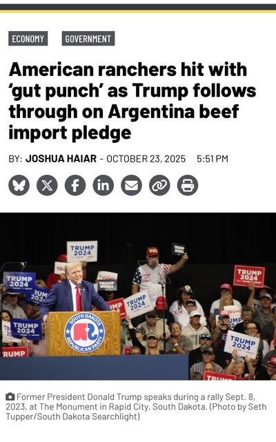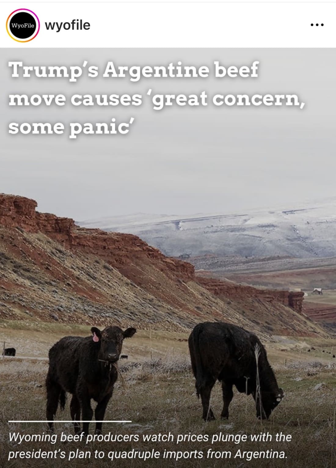 Ranchers and farmers are all angry and scared, but Trump is not on the ballot in 2026. His enablers are: Steve Daines, Ryan Zinke, and scores of other republican posers. If all Americans, especially ranchers, want to stand up for themselves, their livelihoods, and the legacy of American independence, then they’ll first need to unelect all of the suckup Republican Senators and Representatives who would rather shoot their own constituents in the back than stand up to Donald Trump and his mad crypto cronies. 1 https://subscriber.politicopro.com/article/2025/10/trump-beef-argentina-farmers-republicans-00618826 2 https://www.facebook.com/SteveDainesMT/posts/great-to-meet-with-argentina-president-javier-milei-he-took-a-chainsaw-to-govern/1196208271862469/ 3 https://www.perfil.com/noticias/politica/en-pleno-escandalo-por-libra-milei-se-reunio-con-un-senador-republicano-y-se-prepara-para-viajar-a-eeuu.phtml 4 https://www.reuters.com/business/how-four-big-companies-control-us-beef-industry-2021-06-17/ 5 https://www.wlj.net/ranchers-rebuke-plan-to-import-more-argentina-beef/ You’re currently a free subscriber to Montana Dispatch -Truth, Beauty & Resistance - by Ryan Busse. For the full experience, upgrade your subscription. Thank you for reading and sharing this Montana Dispatch with a friend. |