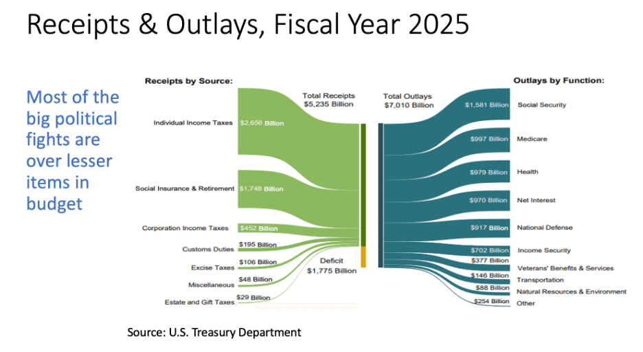 The Treasury Department recently released its estimates of government spending, revenues, and the deficit for the fiscal year 2025, which ended on September 30. For those willing to look beyond political rhetoric, the data clearly show the severity of our budget crisis. Non-wartime deficits relative to our national income at this level of low unemployment are at all-time highs, while debt as a share of national income will soon reach records, even surpassing what was needed to fight World War II. The data also reveal why our budget choices reflect those of a declining economy. Very little in the largest spending categories is allocated to workers and their families, or to efforts that would promote upward mobility and wealth building for most individuals, as I detail more thoroughly here. Meanwhile, recent legislation and executive actions primarily focus on vulnerable constituencies rather than on the parts of the budget that continue to increase the national debt at unsustainable rates. The deficit for 2025 hit $1.8 trillion, roughly the same as in 2024. At 6 percent of GDP, it’s unlike anything we’ve seen during times of relative prosperity. For example, from 2013 to 2019, after the initial recovery from the Great Recession, the deficit was at 3.4 percent. Remember, a non-recessionary deficit of 3.4 percent is already unsustainable because it doesn’t provide enough resources to handle a recession or emergency. The COVID-19 and post-COVID-19 years clearly show this failure, as the debt-to-GDP ratio surged and continued to rise afterward. Budget deficits have been a concerning trend throughout this century, and the situation has only gotten worse. The largest spending categories in the budget are Social Security and Medicare, other health care expenses (mainly Medicaid and Obamacare), interest on the debt, and defense (see graph above). The first four have been increasing automatically—that is, without new appropriations—at a very rapid pace. Meanwhile, Congress has been enacting significant increases in defense (the fifth-largest item) and veterans’ benefits. Even with those increases, the interest on the debt surpassed defense spending for the first time in U.S. history only last year and this year. The other items in the budget have been growing at a much slower rate than our national income and, in some cases, have not increased at all in real terms. So what did Congress and the President do this year? They reduced income taxes while passively allowing the President to offset some of those cuts with tariffs. Regardless of their constitutionality, tariffs imposed whimsically by the President are a highly inefficient, price-increasing source of revenue. They often decrease the international competitiveness of the very industries they claim to support. On the spending side, Congress and the President focused on government employees, foreign aid recipients, and other smaller budget items. The only exception was the cutback in health programs other than Medicare, with some reductions in the growth rate for Medicaid and Obamacare exchange subsidies. A significant portion of those cuts will affect lower-income beneficiaries. While controlling government health spending is necessary, it won’t be effective if it targets only those groups. Additionally, many beneficiaries will likely visit emergency rooms more often, and hospital administrators will probably find ways to pass those costs onto you through higher insurance charges. Once again, I urge you to look at the graph. Is this the kind of government you support? Are you comfortable passing so many costs onto future taxpayers, including any children and grandchildren you might have? Do you agree with spending priorities that largely ignore working families? Do you approve of how the government has responded this year with tax cuts that further fuel unsustainable deficits and debt? Do you support cultural warfare and attacking vulnerable groups in small parts of the budget rather than focusing on the broader policies that address how the government collects and spends your money? Lastly, are you willing to give up something now to free up resources for something better in the future? Please read and share my recent book, Abandoned: How Republicans And Democrats Have Deserted The Working Class, The Young, And The American Dream. It lays out the long-term issues that have led to today’s political morass and how efforts to promote upward mobility and wealth building for all must form a significant part of tomorrow’s agenda.Please also recommend this column to others. Less importantly, if you’re a free subscriber, you can upgrade to paid. |