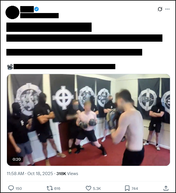 A 35-second video promoting Active Club England and seven regional UK clubs received over 315,000 views on X within a week of its October 18 posting. The post, made by a blue-check verified X user, also received over 5,300 likes and was shared over 615 times. The post was made by an American account, but was shared by the central Active Club England account on X. The video featured footage of Active Club members boxing, training, and hiking, and included links to the group’s website, X, and Telegram accounts, as well as a specific Telegram contact for recruitment. The original X account that posted the video also posted videos endorsing Nazi Germany and Adolf Hitler, and racist and antisemitic AI-generated videos.