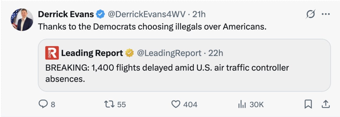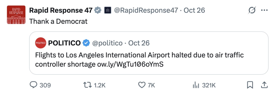 Democrats Refuse Targeted Relief: Senate Democrats are blocking Sen. Ted Cruz’s bill to immediately pay the nation’s 13,000 air traffic controllers, insisting instead on full government reopening that includes their demands for expanded Affordable Care Act subsidies, while Republicans have repeatedly offered a “clean continuing resolution” to fund all operations.