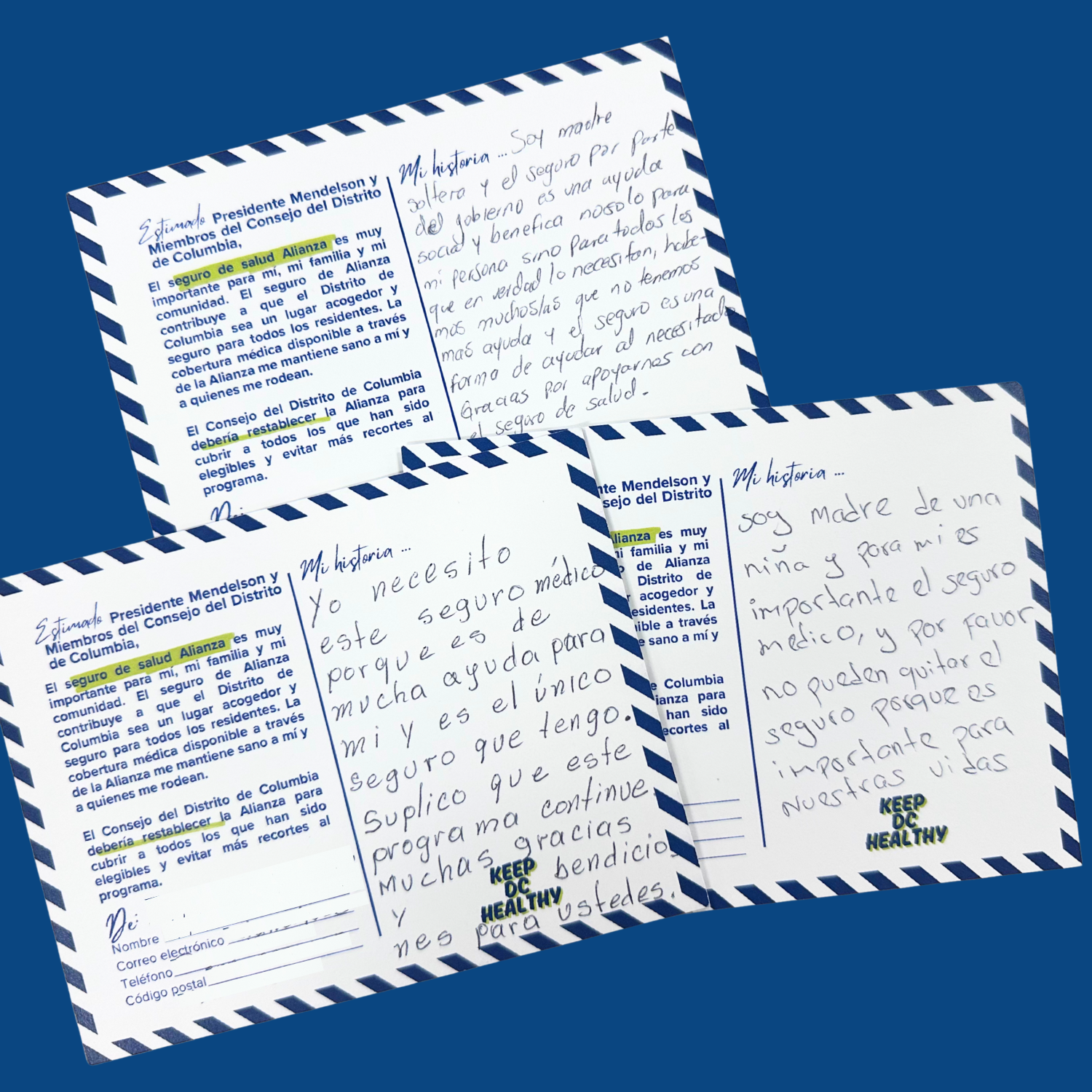 ¿Puede recoger postales en su comunidad? Animamos a todos que las firmen, pero los testimonios más impactantes que hemos visto provienen de pacientes, proveedores de atención médica y miembros de la comunidad que tienen o tenían seguro Alliance.