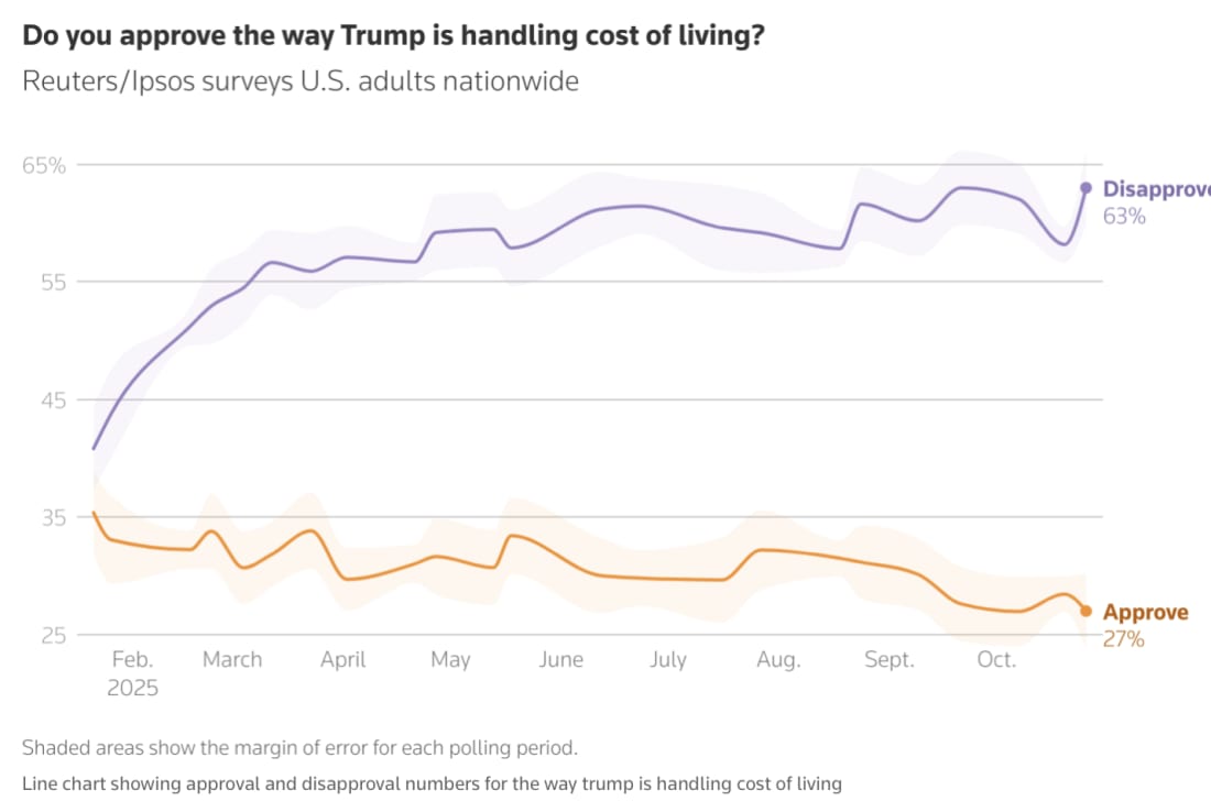The “Trump economy” image has officially lost its shine. Cost of Living Concerns SpikeThe same Reuters/Ipsos poll found a sharp spike in disapproval of Trump’s handling of the cost of living. While shutdown numbers remain steady, there’s a clear opening for Democrats: 73% of respondents — including a majority of Republicans — said they want ACA subsidies extended. That’s not just a policy win. It’s a moral and political one — and it underscores how far Trump has fallen on the issue that once defined him. You’re currently a free subscriber to Lincoln Square Media. For full access to our content, our Lincoln Loyal community, and to help us amplify the facts about the assault on our rights and freedoms, please consider upgrading your subscription today with this limited-time offer: Not ready to subscribe? Make a one-time donation of $10 or more to support our work amplifying the facts on social media, targeted to voters in red states and districts that we can help flip. Every $10 reaches 1000 Americans. The Truth needs a voice. Your donation will help us amplify it. Want to help amplify this post? Please leave a comment and tell us what you think. |