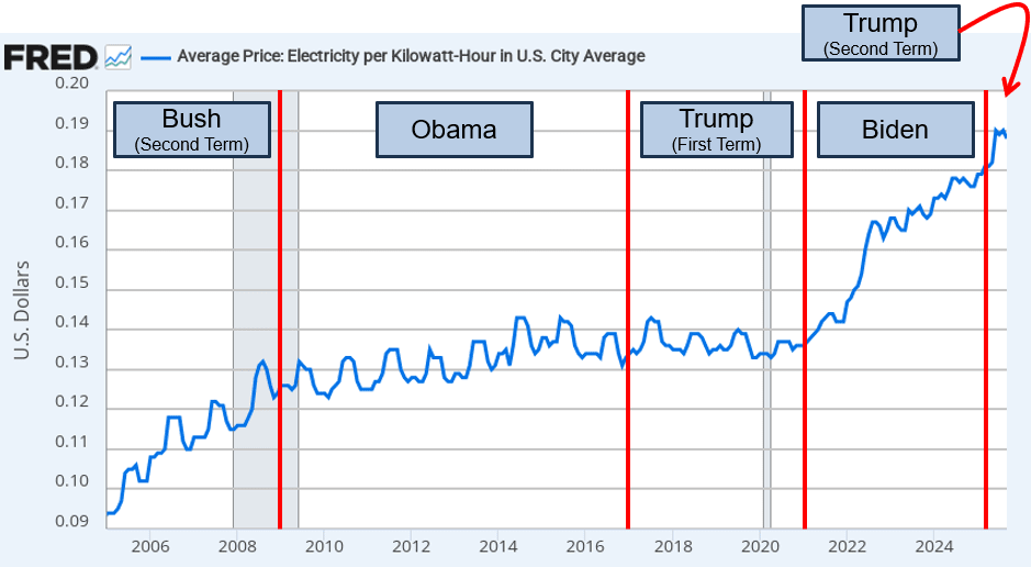 All of this is happening despite the fact that energy prices were a stronger issue for Republicans than Democrats in the last election.⁵ It was an effective talking point in ’24 because energy costs did go up considerably during the Biden years,⁶ after having been reasonably flat through the Obama and first Trump presidencies.