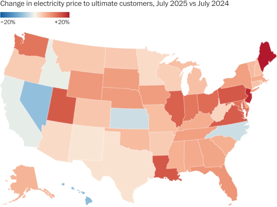 Energy costs are up (almost) everywhere since last yearI noted in my last article that voters trust Republicans more than Democrats on pocketbook issues, which is a huge part of the reason that Trump was elected in ’24. So it’s notable that in the last year, electricity prices are increasing twice as fast as inflation. They’re up almost everywhere in the country, something that will only accelerate as the policies of the OBBBA go live.⁴