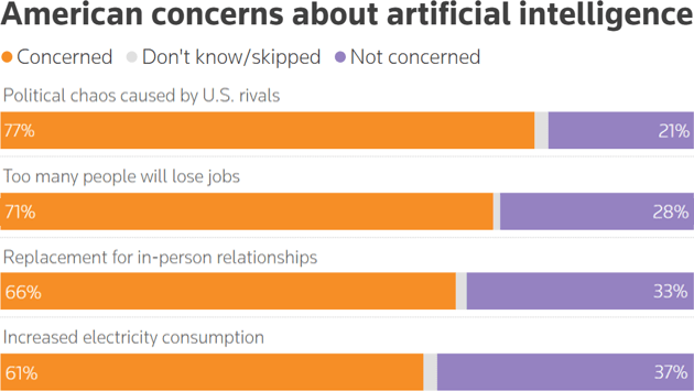 I think it’s important to note: I steadfastly disagree with the Republican talking point that investments in renewable energy are why electricity costs went up. After all, energy prices spiked everywhere in the world after Biden was elected, not just in the United States. Much more of this has to do with Russia’s invasion of Ukraine, OPEC price collusion, and lingering post-COVID supply chain issues. I’m all for Democrats throwing Biden under the bus, and I don’t think he’ll be remembered as a good president. He did things I would’ve done differently. But the correct response to rising energy prices during the Biden years is not to disinvest in renewables like nuclear, wind, and solar. In any event, Biden isn’t around to blame anymore, and public opinion has duly moved: 44% of Americans trust Democrats on energy issues vs. 43% who trust Republicans, a statistical tie.⁷ Energy costs, in all likelihood, will continue to go up. And while I’m not cheering for that—one-in-six American households struggle to pay their energy bills—it creates a potential wedge issue for Democrats. Americans don’t trust crypto and worry about AIMore on the details of Republican policies in a moment, but a significant driver of increased energy costs: AI and crypto companies, both of whom are fast becoming some of the Republican Party’s most unwavering allies and donors. Before we talk about the impact that AI and crypto companies have on energy consumption, it’s worth noting that Americans are extremely skeptical of both industries. 58% of Americans say that “AI could risk the future of humankind,” which isn’t exactly suggestive of an electorate that’s excited to double down on artificial intelligence. Overwhelming majorities are concerned that AI will lead to chaos, job losses, and yes, higher energy costs.⁸