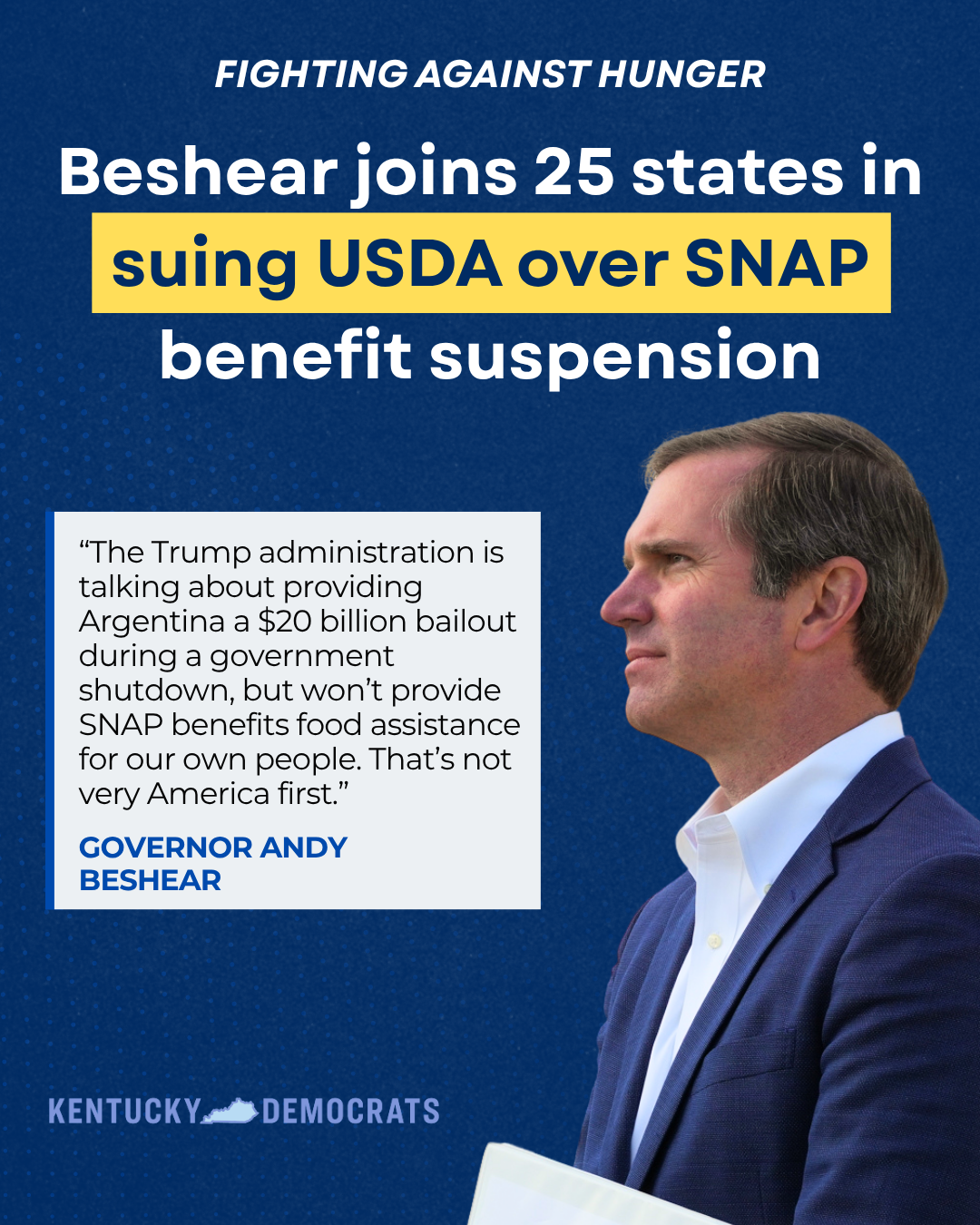 He just joined a lawsuit to protect SNAP benefits for 600,000 Kentuckians after Trump decided emergency funds weren't worth using to feed families. Governor Beshear and Congressman Morgan McGarvey are also calling out Republicans in Congress for refusing to extend ACA tax credits that keep health insurance affordable for 100,000 people in our state.