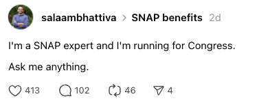 News like this is why we built The Feed: to analyze the politics, expose underreported trends, and back the creators who aren’t waiting for permission to tell the story. If that sounds like your kind of journalism, back it here: This piece is authored by public interest lawyer and a 2026 Congressional candidate (VA-1), Salaam Bhatti, creator of A Paycheck Away. Subscribe to his work to start your journey towards ending poverty by learning about issues, exploring solutions, and ways you can act. Don’t forget to vote in Virginia on Nov. 4, 2025. I asked my friend at his kids’ birthday party, “How much do you think the average SNAP benefit per person per day is?” He replied, “I don’t know, $80?” I told him, “It’s $6.16.” His eyes nearly jumped out of his face and he said, “THAT’S the amount they’re trying to cut?! What is there to gain from that?” This was before the Big Beautiful Bill. Now, Republicans are on the cusp of achieving their fantasy: ending SNAP entirely. Now, over 42 million Americans and an entire economy —from farmers to grocery stores —are about to face a $9 billion loss in November. How did we get here?Republicans are really good at lying, picking fights, winning arguments, and getting people on board with what they want to do - but once they get there, they have absolutely no plan. Historically, these lies have destabilized regions around the world with millions of innocents killed. Case in point: 20-year-long war in Iraq/Afghanistan based on a lie, cost over $3 trillion, millions killed. All for what? Not a damn thing. Now that pattern is coming home. The government shutdown is the icing on the cake of an entire year devoted to destabilizing the US government. Republicans used a chainsaw as a seam ripper to destroy the American quilt through layoffs, firings, and the Big Beautiful Bill. Now, Republicans face no urgency to reopen the government. They have handed power over to the President, letting him do whatever he desires - which is exponentially dangerous considering he’s a felonious pedophile. What happens next?Among many devastating consequences, one impact of the government shutdown is that SNAP benefits can’t be transferred from the federal government to the states because the government lacks a budget - not to be confused with how Republicans lack a spine. Republicans kept putting through “continuing resolutions” (kicking the can down the road) instead of making a budget, which is quite literally their job. While a contingency fund exists primarily to fund SNAP benefits during a shutdown, the White House claims it cannot be used because the appropriations for SNAP benefits no longer exist, because there’s no budget. Was there a budget for $40 billion to go to Argentina? Was there a budget for a $300 million ballroom? Was there a budget for adding $1 trillion to the U.S. debt in mere weeks? In the words of a song from High School Musical, “No, no, no.” This November, over 42 million Americans will lose SNAP benefits just in time for the holiday season. Some states, like Virginia, may try to make up the difference, but it’s not sustainable and certainly not replicable for poorer states. SNAP benefits are typically exhausted by the third week of the month. The fourth week is a stretch week for these families. So, we’re already in a critical moment for millions of families. Come November, parents will not only skip meals, but things will get dire enough that children will be skipping meals. When these children get hungry in schools, they’ll act out in different ways (as any of us do when we’re hangry), which disrupts the class and leads to them facing school discipline issues, which starts a school-to-prison pipeline chain effect. All because Republicans wanted to protect pedophiles, fund a ballroom bunker, and give money to other nations. But wait, there’s more! SNAP doesn’t only help 42 million Americans. Everyone from the farmer/manufacturer-to-grocery store supply chain benefits from the ~$9 billion/month. Every SNAP dollar generates up to $1.80 in economic activity. This is money that isn’t hoarded like a tax cut for the wealthy. It is spent within weeks. This helps grocery stores hire staff, pay the truck driver who transports the food, and pays the farmer to grow the food. SNAP does more for the economy than tax cuts for the wealthy ever have. What do we do?Donate Money to Food Banks Food banks do not have the infrastructure to take on the hole left by SNAP. For every meal a food bank provides, SNAP provides nine. But, food banks are all we have to combat the need before us. For every dollar we donate, they can provide 3-4 meals. Volunteer at Food Banks Food banks have seen a massive increase in traffic over the year. They’ve had to stand up mobile/satellite locations to meet people where they are. As a result, the need for volunteers has increased. Donate your time to help our neighbors. Apps to help find grocery deals Flashfood and Too Good to Go are two options to find discounted groceries. Do you know of others? Leave them in the comments below! Finally, when Congressional elections happen next year, remember in November who did this. This is the immediate harm, the Big Beautiful Bill made changes to SNAP which will be realized in the next couple years. Republicans betrayed the American people and they must pay. You're currently a free subscriber to The Feed. For the full experience, upgrade your subscription. |