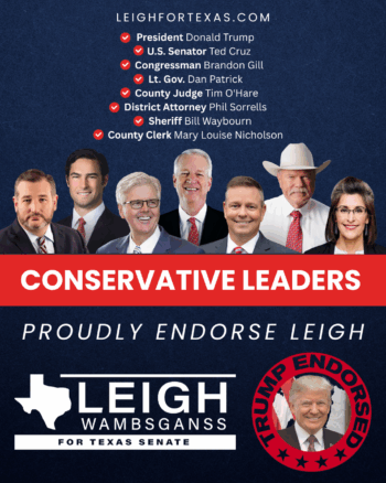 I am the battle tested leader ready to hit the ground running on Day 1 and I'm asking for your vote. With a proven 30+ year conservative track record working for conservative legislation and policies, I'm running for Senate District 9 to give Tarrant County the strong, unapologetic conservative voice it deserves. Today and tomorrow are your LAST CHANCE to vote early ahead of Election Day. Find early voting polling locations here. Reminder, you can vote at any polling location in the county. Polls are open from 7 AM to 7 PM through Friday, October 31st for early voting, and Election Day is Tuesday, November 4th. Strong Republican leaders like President Donald Trump, U.S. Senator Ted Cruz, Congressman Brandon Gill, Lt. Governor Dan Patrick, all county-wide elected officials like Judge Tim O’Hare, D.A. Phil Sorrells, Sheriff Bill Waybourn, County Clerk Mary Louise Nicholson, and hundreds of grassroots organizations and individuals have endorsed my campaign for State Senate because they know I have worked for over 30-years for conservative policies and principals. Join us in keeping Texas conservative by voting early TODAY for Leigh Wambsganss for Texas Senate.