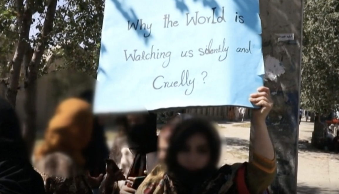 Afghan woman holding a sign saying "Why is the world watching us so silently and cruelly?" Photo by Getty Images  |