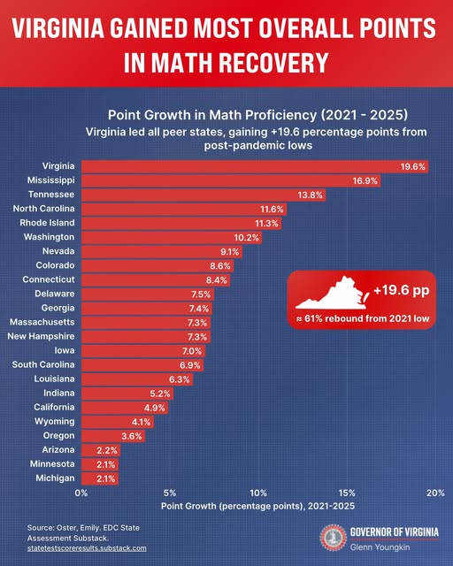 But thanks to our ALL IN Virginia Intensive Tutoring initiative and a renewed commitment to high expectations, math proficiency among 3rd–8th graders has regained +19.6 points from the post-pandemic low—the most by any of our peer states.