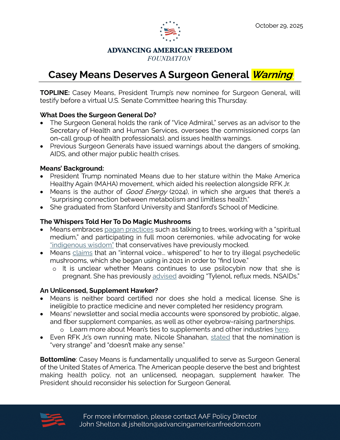The Senate Must Vote 'No' on Casey Means As we explained in a memo this week, President Trump’s nominee for Surgeon General, Casey Means, raises serious questions about judgment and qualifications for one of the nation’s most trusted health positions. Though educated at Stanford, Means is unlicensed, never completed a medical residency, and has built her platform around wellness fads, supplement sponsorships, and unscientific spiritual practices.