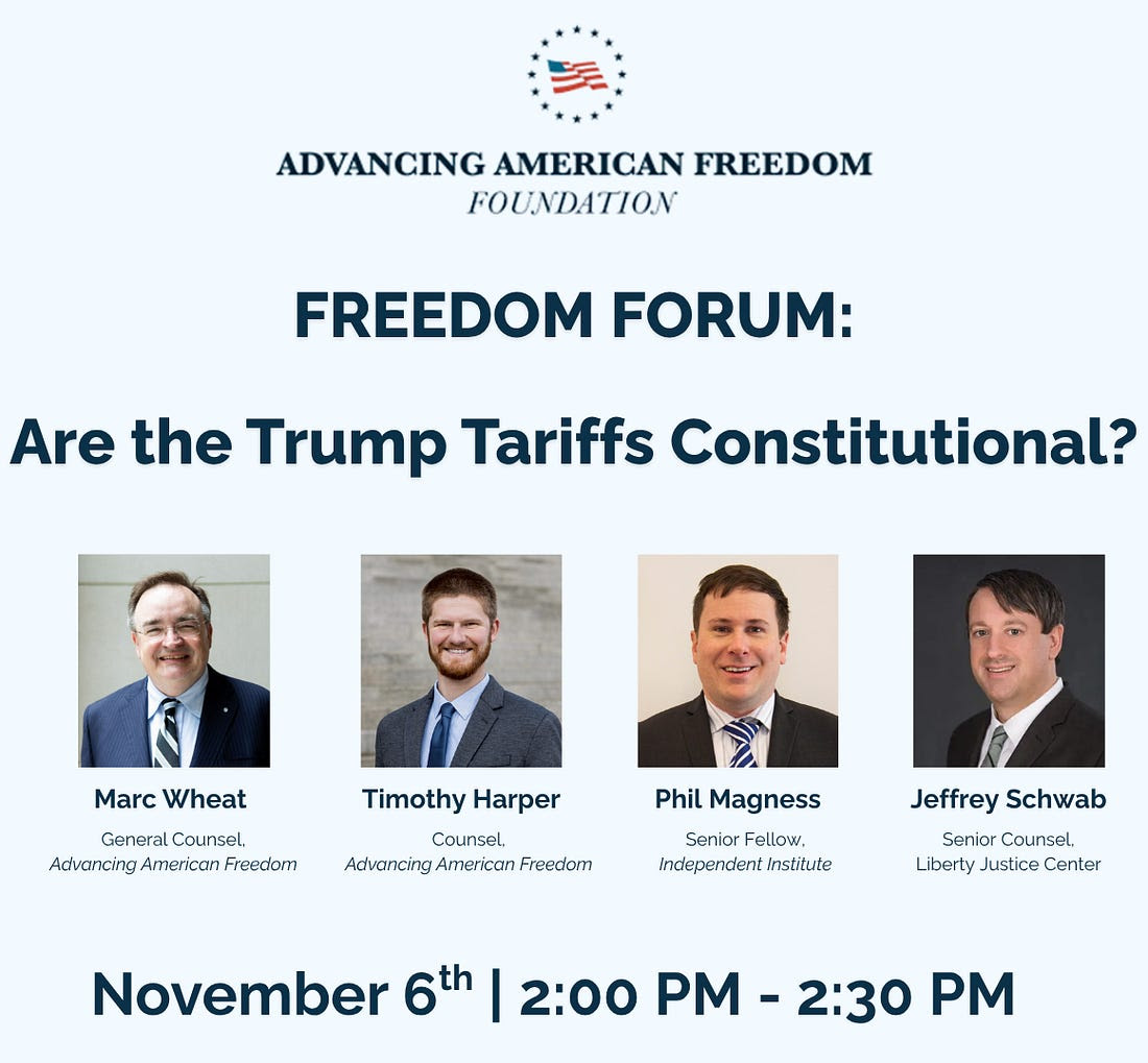 Next week, the Supreme Court will hear oral arguments in the cases challenging many of President Trump’s tariffs, the outcome of which affect the course of politics and constitutional law for decades. Jeffrey Schwab, one of the attorneys representing V.O.S. Selections, Inc., economic historian Phillip Magness, and members of our Advancing American Freedom Foundation legal team will walk us through what happened at oral arguments and what this case means for the Constitution and economic liberty.