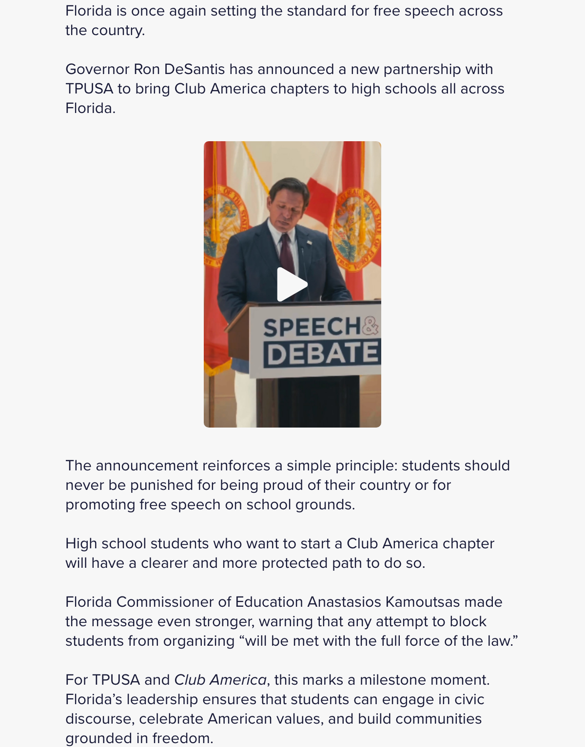 Florida just made it easier for students to stand up, speak out, and organize. Club America is growing and the Left is panicking. Here’s what DeSantis just did.