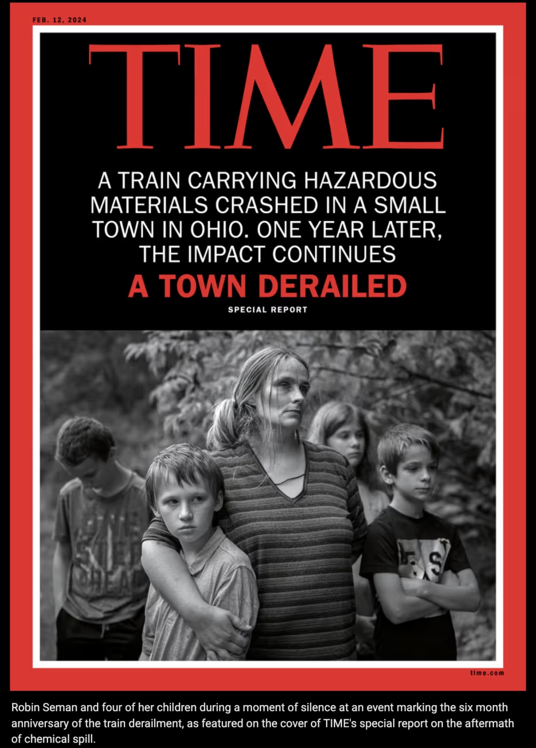 A train wreck is bad enough without tankers full of lethal chemicals flooding the ground, then fires spewing clouds of thick black smoke, drifting over surrounding areas. Residents complained of sudden onsets of chronic nosebleeds, unexplained rashes, difficulty breathing, fatigue, persistent coughs, and other symptoms consistent with dangerous levels of chemical exposure. Local officials asked everyone in East Palestine, a town of 4,000 residents, to evacuate while clean-up efforts were underway, but the surrounding areas were not warned as a toxic gray pall diffused over their homes and farms. Stuart Day and his family live on a farm about six miles from East Palestine, and he watched the plume hover in his valley. With an infant and another child sheltering in a drafty old farmhouse, the Day family’s profound anxiety was compounded by a lack of any answers from the EPA. [photo of Stuart Day] Almost three years later, the clean-up has been largely completed but questions remain. Many homes are abandoned. Many residents experience PTSD and seek pharmaceutical relief from the panic they relive every time a train rolls through town. People are unsure whether to trust their well water, local foods, or government pronouncements about safety. For those who want to leave, they feel stuck – it’s hard to sell a house on a de facto Superfund site.