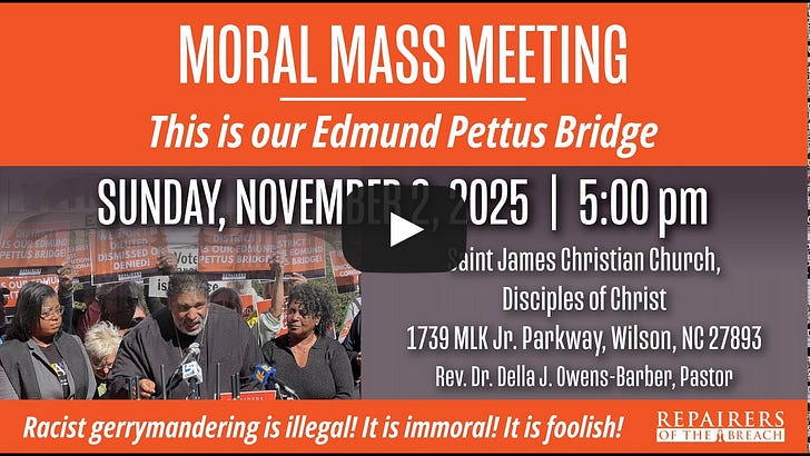 It's Time To Make Our Voices ThunderWhy we've launched a year-long voter mobilization campaign in Eastern North CarolinaThis evening in Wilson, North Carolina, Repairers of the Breach joined Forward Justice and a coalition of partners in Eastern North Carolina to launch a mass voter mobilization effort dedicated to rallying an historic turnout in the 2026 midterms. Donald Trump ordered his MAGA minions in the North Carolina General Assembly to rob power from people who reject their extreme agenda. Those of us from Eastern North Carolina refuse to accept this robbery. Our people struggled too long and fought to hard for us to accept this illegal gerrymander. We’ve pledged every nonviolent means at our disposal to overcome power grab and turn it against those who thought they could cheat to maintain control of our government. MAGA extremists cannot win on their agenda, so they have decided they need to steal seats in the US Congress. So just like he did after he lost the 2020 Presidential election, Trump is making calls. Only this time, North Carolina Republicans jumped to do his bidding. House Speaker Destin Hall was very clear about his intentions to draw another Republican seat at the request of the President. Here’s what he said: “President Trump earned a clear mandate from the voters of North Carolina and the rest of the country, and we intend to defend it by drawing an additional Republican Congressional seat.” If they had a mandate from voters, why would they need to draw additional seats to win the next election? The truth is that they want the power of the first Congressional District because Black voters make up approximately 40% of the district, and the growing Latino communities make up more than 7%. That means that Black and white and Latino together can elect Congress persons from this district who care about the things that most Americans want - things like living wages, universal access to healthcare, diverse, fully-funded public education, affordable housing, and a pathway to citizenship for our immigrant neighbors. They want this district because we have elected representatives for decades who will not bow to any would-be king. This district has long been at the center of the Black political experience in North Carolina. It includes counties where Black residents fought for the right to vote, to work with dignity and to be represented. As state representative Rodney Pierce has made clear: