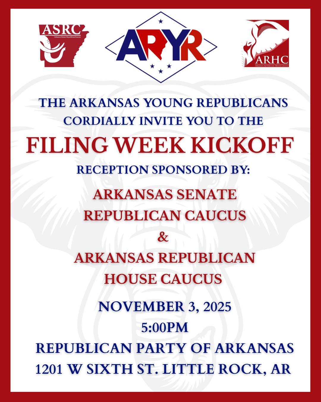 The Arkansas Young Republicans, the Arkansas Senate Republican Caucus, and the Arkansas Republican House Caucus cordially invite you to join us for our Filing Week Kickoff Reception!