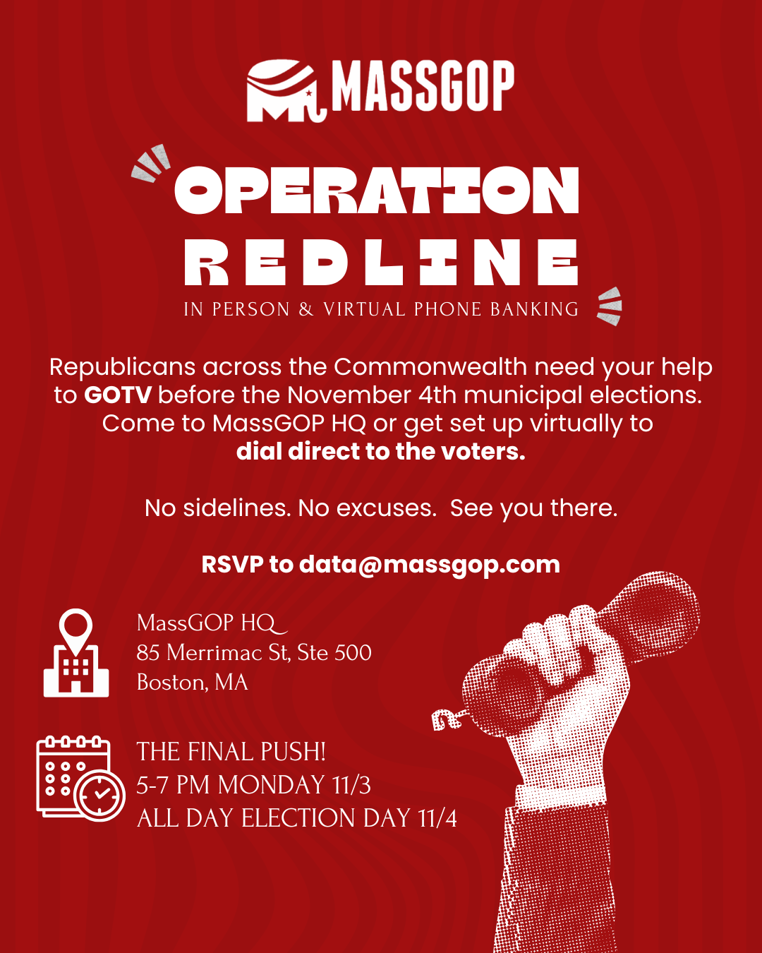 Join us virtually or in person at MassGOP HQ on Monday and Tuesday to make voter contact calls and drive out every last conservative vote.