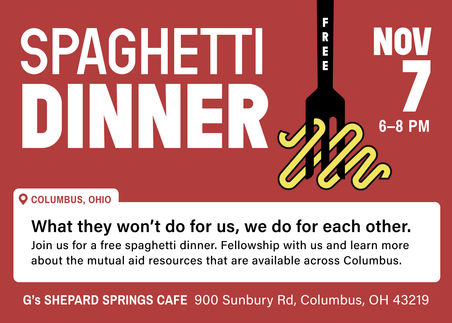Later in the week, join us for an Emergency Spaghetti Dinner at G’s Shepard Springs Café (900 Sunbury Rd, Columbus, OH 43219) on Friday, November 7. We’re hosting this free community meal in response to recent challenges with SNAP benefits, starting in the neighborhoods most impacted.