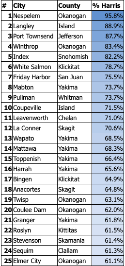 In past years, this list would have been dominated by Hispanic and Native American communities. The #1 entry, technically more Democratic than Seattle, remains the Colville Reservation's Nespelem (Harris 46, Trump 2, Other 1). As Democrats have sustained losses among Hispanic voters, formerly top-ranking towns have fallen down the list, including Mabton (73.7%), Wapato (68.5%), Mattawa (68.3%), and Toppenish (66.4%).