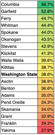 Rural, working-class counties number among Washington's lowest- and highest- turnout counties. Southeastern Washington's diminutive Columbia (56.7% historic turnout, county seat Dayton) and Garfield (52.8%, Pomeroy) are near the top of the list; yet, demographically similar counties are also near the bottom, including Skamania (34.0%, Stevenson) and Pend Oreille (34.3%, Newport). What explains the difference? Rigorous demographic analysis suggests: County and city-level elections in Garfield and Columbia seem to excite voters in a way they don't in Skamania and Pend Oreille.