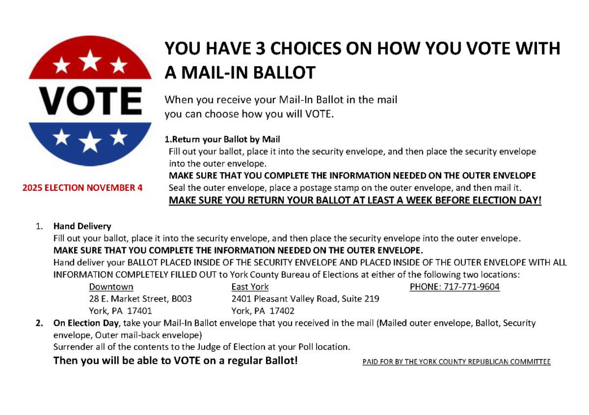 For any inquiries or assistance regarding voter registration, voting, and polling information, we encourage you to reach out to the York County Republican Committee at 717-854-7276.