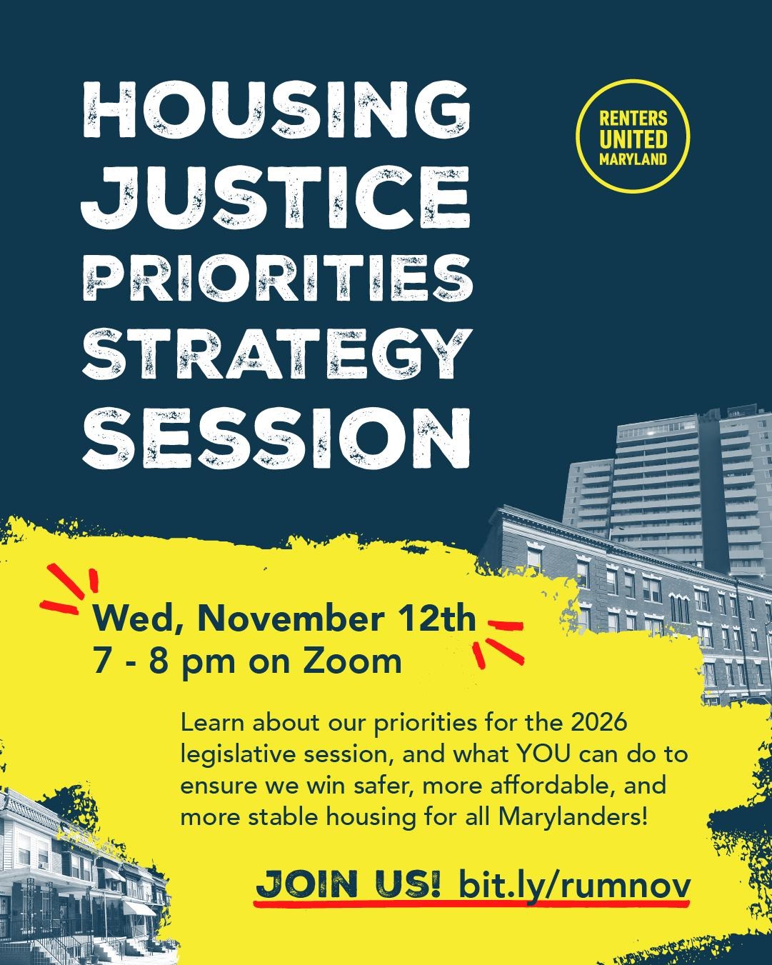 Join us on Wed, November 12th at 7pm on Zoom for a Housing Justice Priorities Strategy Session to discuss our state-level legislative priorities, what it will take to win big for renters in 2026, and what YOU can do to ensure every Marylander has safe, stable, affordable housing! We'll need all of our voices! Join us and bring a friend! RSVP here.