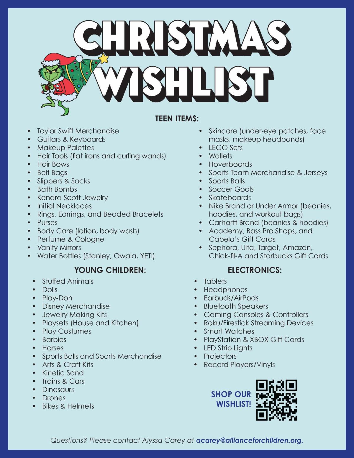 Browse our Christmas Connection website and the wishlist below to donate and secure a variety of items so we have something that fits the interests and style of each child.