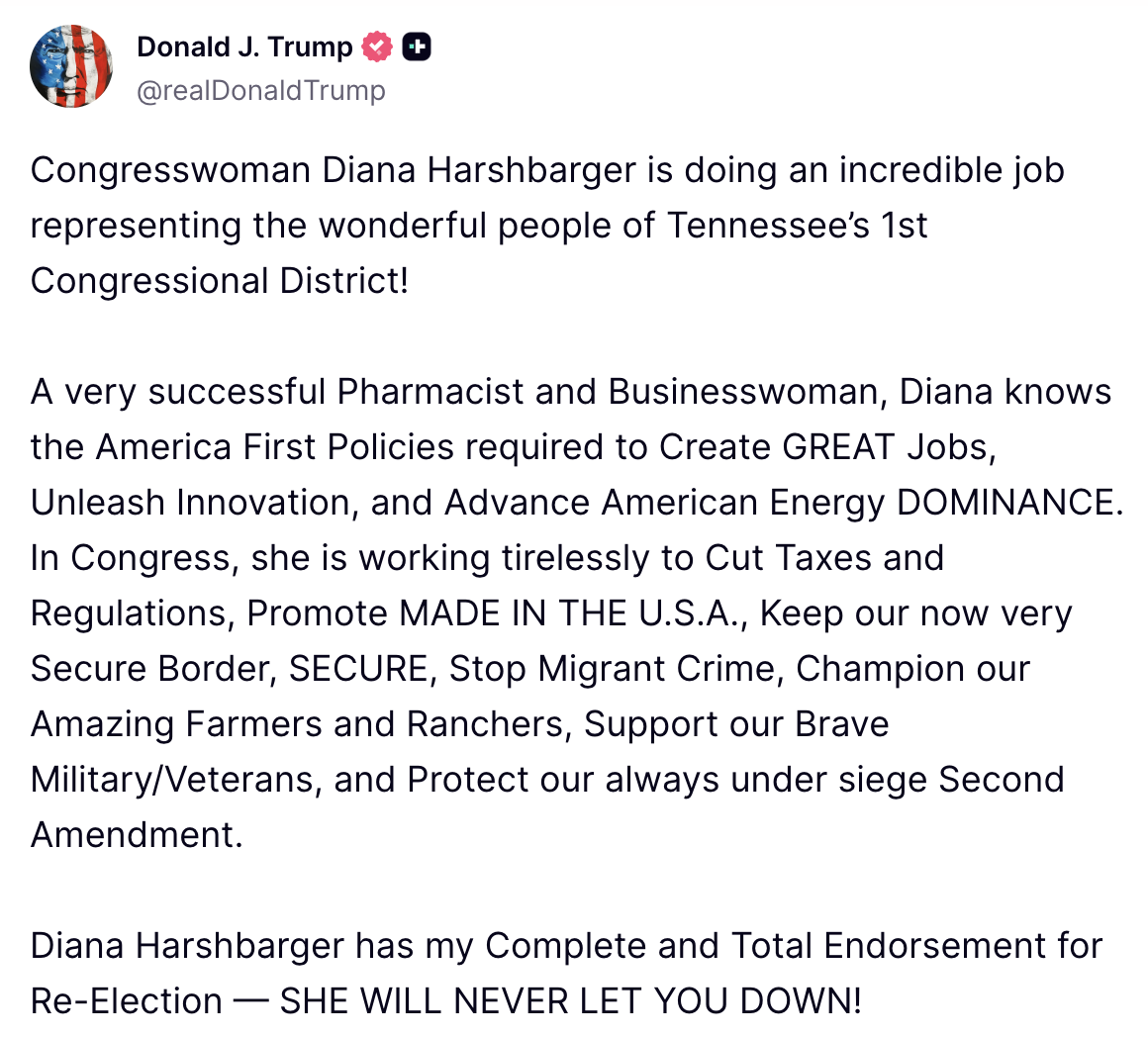 “I’m honored to have President Trump’s endorsement and I’m grateful for his recognition of the work we’re doing on behalf of East Tennessee. My focus remains exactly where it’s always been — serving our communities, supporting local businesses and farmers, protecting our conservative values, and ensuring that East Tennessee continues to thrive. I’ll keep working every day to put America First and earn the trust and support of everyone I represent.” – Congresswoman Diana Harshbarger