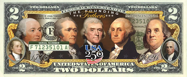 The Founding Fathers $2 Bill is a genuine U.S. legal tender brand new $2 bill that has been transformed into a breathtaking collectible through a unique, high-definition enhancement process.