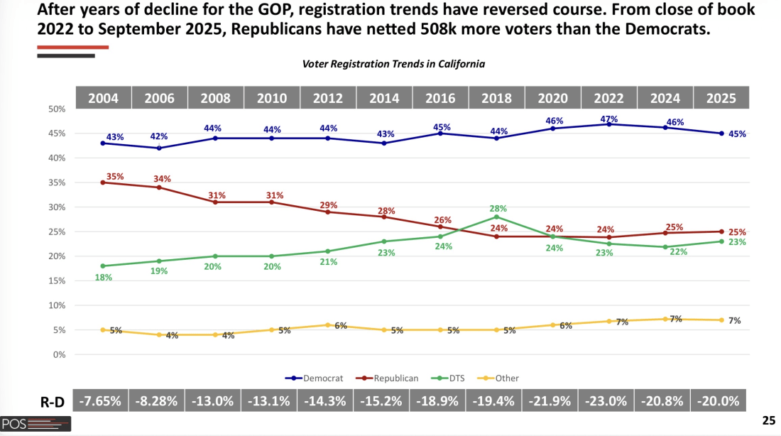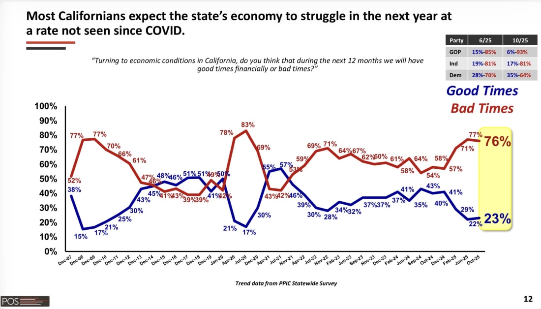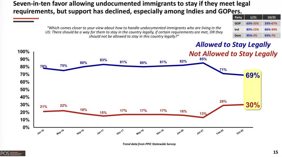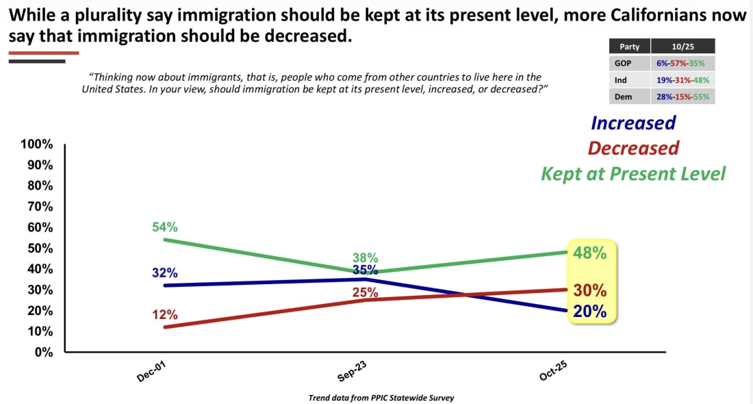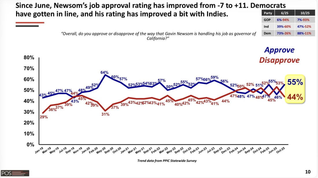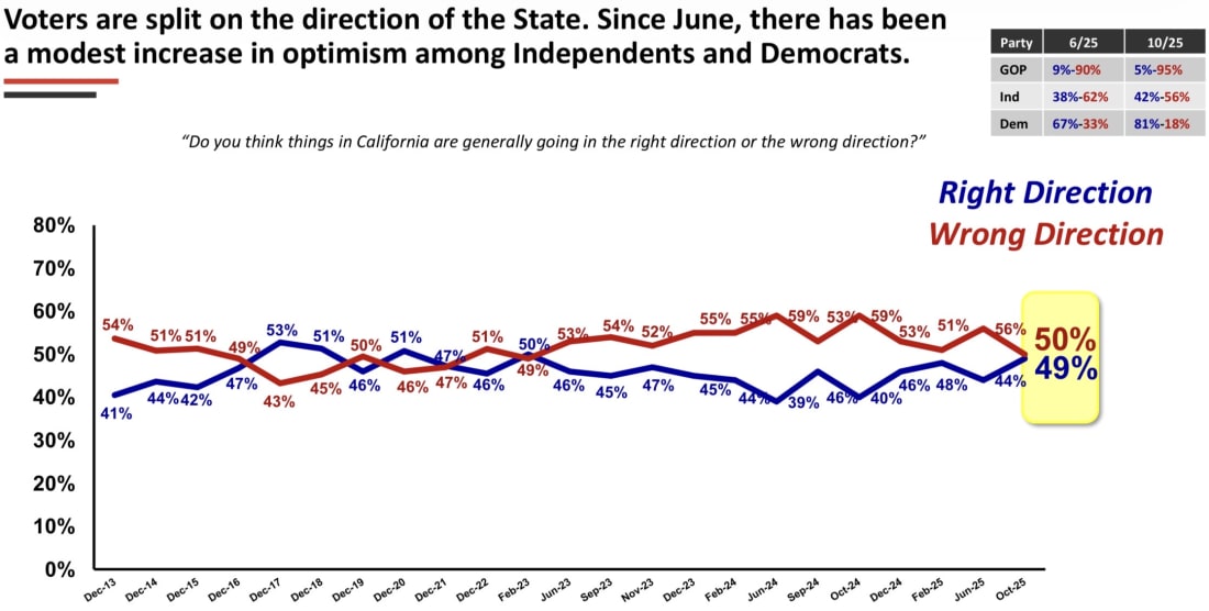 Thank you for being a free subscriber to So, Does It Matter? Please support what we do. And also get 100% of our content (right now you get about 60% of it!). California’s Mood Is Shifting — But Not the Way Sacramento ThinksCalifornia voters are divided over where the state is headed, uneasy about the economy, and showing new doubts about immigration — data compiled by pollster George Nassar captures that uneasy mood.[Our paid subscribers have bonus content below! FOMO? Upgrade today!] California’s Mood Is Shifting — But Not the Way Sacramento ThinksCalifornia voters are divided over where the state is headed, uneasy about the economy, and showing new doubts about immigration — data compiled by pollster George Nassar captures that uneasy mood as he analyses the the latest statewide public opinion survey from the Public Policy Institute of California. Reading the Numbers — and the MoodEvery few months, the Public Policy Institute of California surveys how people feel about their leaders and the state’s direction. This time, veteran pollster George Nassar of Public Opinion Strategies compiled the results into a chart book that reveals a public that appears calmer in the numbers than it feels in daily life. California is essentially split: 47% of adults say the state is headed in the “right direction,” while 51% say “wrong track.” Among likely voters, the divide flips — 49% say the direction is right and 50% say it’s the wrong track. Optimism is fragile and concentrated among Democrats; independents remain skeptical. Newsom’s Rebound, Driven by His BaseGovernor Gavin Newsom’s job approval has improved from –7 net in June to +11 net today, thanks mainly to Democrats closing ranks. Among his own party, approval jumped from +47 to +77. Independents ticked up slightly, while Republicans remain almost uniformly opposed. It’s not so much a comeback as a show of partisan loyalty — Democrats circling wagons while Californians face rising costs and constant political showmanship. California’s Optimism Rests on Shaky GroundThe modest lift in sentiment is being read as progress in Sacramento, but it’s mostly a partisan bounce. Among independents, barely four in ten think the state is on the right path. Three-quarters (76%) of Californians expect financially bad times ahead — pessimism that cuts across the political spectrum: 93% of Republicans, 81% of independents, and 64% of Democrats. Those numbers echo the kitchen-table reality — insurance hikes, rent spikes, and grocery bills that never seem to come down. Those figures say more about the mood than any campaign speech could. The Most Dramatic Movement: ImmigrationThe most significant shift in this survey is related to immigration. In 2021, 85% of likely voters said undocumented immigrants should have a path to legal status; today, that number has decreased to 69%. Opposition has more than doubled, from 13 to 30 percent. Among Latino voters, opposition has increased by 13 points — from 6% to 19% — since 2021. That shift isn’t driven by hostility — it’s voters trying to balance compassion with a sense of order and cost. For the first time in PPIC tracking, more Californians now prefer decreasing immigration (30%) than increasing it (20%). This is very interesting considering the high profile this divisive issues has had in California, especially. Public Order: The Perception Gap WidensConcerns about homelessness and crime have eased, though both remain top-tier issues. The share saying homelessness increased in the past year dropped from 73% (Feb 2023) to 48% now. The share saying violence and street crime increased fell from 48% to 30%. But “less worried” doesn’t mean satisfied. Majorities still describe property crime and homelessness as serious problems. Californians may sense progress, but they expect visible results — not more speeches about compassion without accountability. A Quiet Reshaping of the Voter MapAfter years of decline, Republican voter registration is quietly rebounding. From 2022 through September 2025, the GOP has garnered 508,000 more registered voters than Democrats statewide. That surge is even sharper in House districts, such as (pre-Prop. 50) CA-13, CA-45, and CA-27, where Republican registration gains outpace Democratic growth by five-figure margins. These electoral impact of these changes on House Districts will be muted with the assumed-passage of Prop. 50, of course. California politics tends to change slowly — right up until it changes fast. So, Does It Matter?Nassar’s October tracking deck shows a state trying to reconcile its confidence in ideals with frustration over outcomes. People still want a California that feels welcoming and secure, but they’re less convinced Sacramento’s way of governing can deliver it. Voters aren’t turning conservative so much as pragmatic. They’re looking for results, affordability, and a sense of stability, rather than political theater. It is worth mentioning that Governor Newsom’s strong upward move among liberal voters is not happening in a vacuum. His rebound coincides with a flood of anti-Trump messaging — both in his national positioning and in the Yes on Proposition 50 campaign, which has been framed almost entirely as a referendum against Trump. Given the nonstop ads and media coverage, it’s not surprising that left-leaning voters are closing ranks around him. You can read the numbers as a slight recovery for incumbents — or as proof that California’s political class is drifting away from everyday reality. If state leaders mistake this rebound for renewed trust, they’re misreading the room. BONUS FOR PAID SUBSCRIBERS: Below the fold, you can see the runner-up cartoon for this post, which is great (tough call) and you can check out George Nassar’s full October 2025 chart deck, featuring a bunch more charts besides the ones I’ve tucked into this analysis — each offering a clearer look at wh