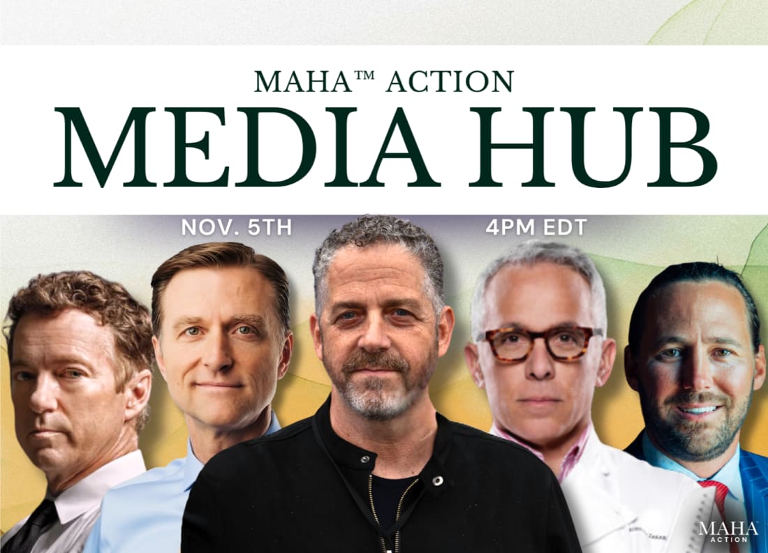 By The MAHA Report Please join us on Wednesday, November 5, from 4pm - 5:15pm Eastern, for another episode of MAHA Action’s weekly media hub! Wednesday’s program features MAHA Action president and host, Tony Lyons; nutrition expert, Dr. Eric Berg; genomics researcher and DNA sequencing expert, Kevin McKernan; Republican U.S. Senator from Kentucky and ophthalmologist, Dr. Rand Paul; health freedom leader and stem cell therapy pioneer, Ed Clay; physician, inventor, scientist, and author, Dr. Robert Malone; HHS special advisor and prolific MAHA advocate, Calley Means; biodynamic farmer, herbalist, and MAHA activist, Leigh Merinoff; comedian, podcast host, and MAHA advocate, Russell Brand; Administrator of the Centers for Medicare & Medicaid Services, Dr. Methmet Oz; Co-Founder and Chairman of Power Analytics Global, Keith Barksdale; author of One Scan Saved My Life, Shira Boehler; and celebrity chef, Geoffrey Zakarian. This week’s topics include: reforming our food supply, weather modification, holding Big Pharma to account, and the latest wins from across the world of MAHA. To attend our media hub, simply click the free registration link here. All of our Media Hub events are free — and open to the public and the press. Hope to see you @4pm!! Thank you for subscribing to The MAHA Report You can follow us at: TheMAHA_Report on X You can also follow us at: MAHA Action on Facebook Make America Healthy Again™ and MAHA™ are trademarks owned by MAHA TM LLC |