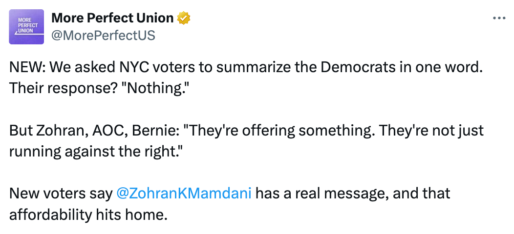 The politics that propelled Zohran to victory are a true antidote to this situation: Positive, bold, ideas-driven, and focused on the needs of the working class instead of the billionaire class. He’s generated so much excitement among regular folks at a time when Democrats need it most.